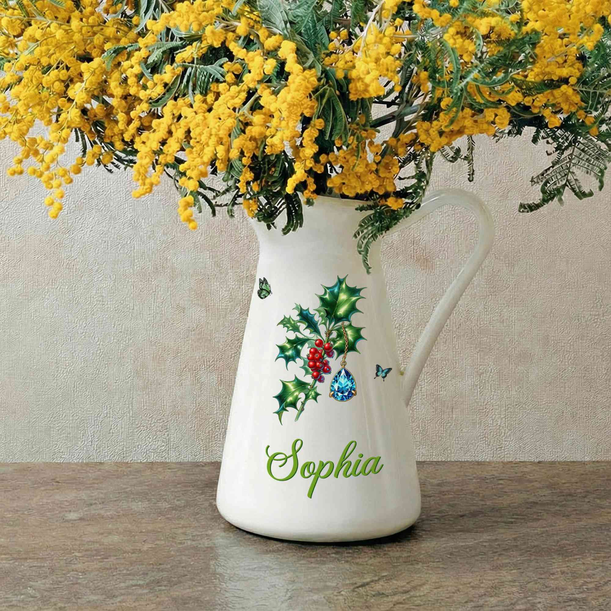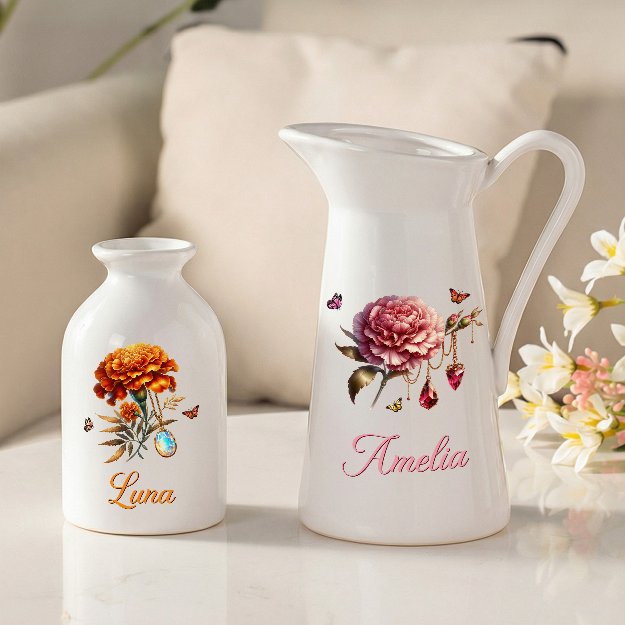 Birth Flower & Birthstone Design - This ceramic vase features a delicate birth flower paired with a matching birthstone, symbolizing love, personality, and meaningful life moments. The soft floral artwork and balanced shape create a warm, elegant accent for any home décor style.
