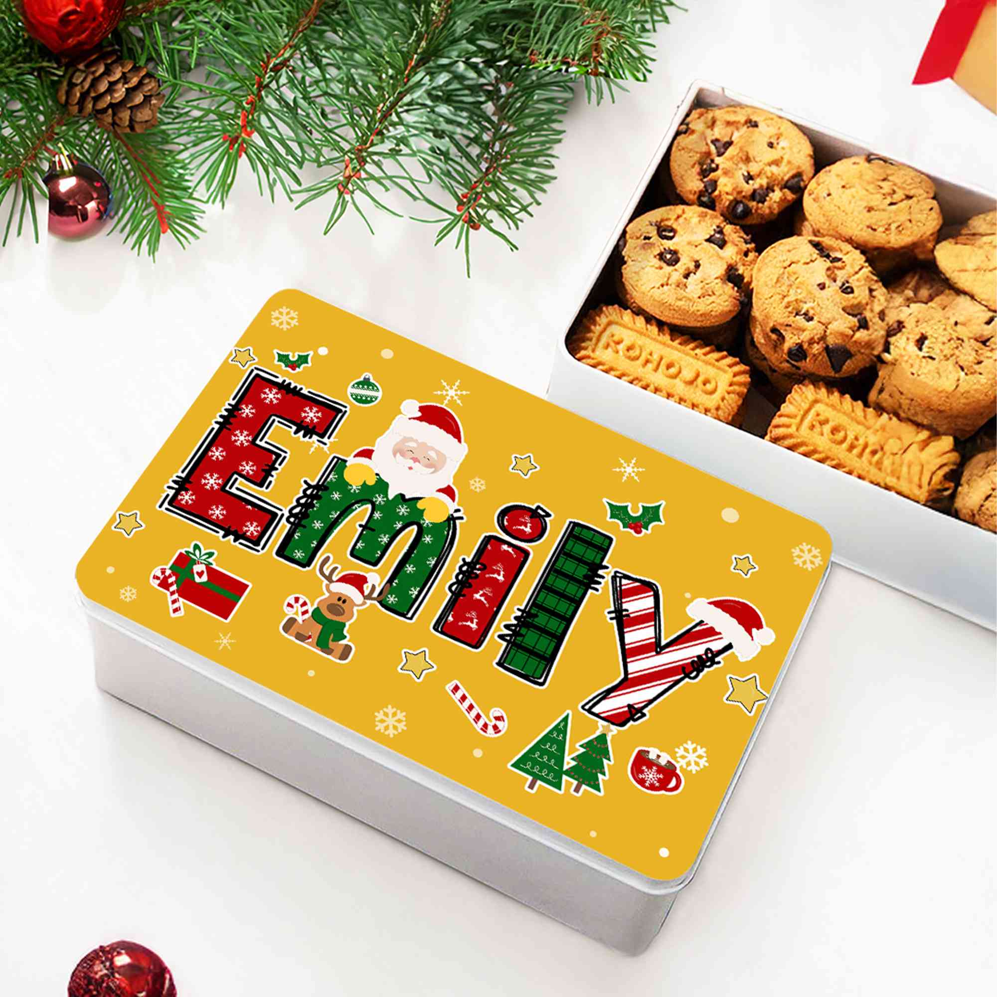 Personalized Name Cartoon Christmas Theme Treat Tin with Lid, Biscuit Box, Tinplate Container, Holiday Party Favor, Christmas Gift for Kids/Family